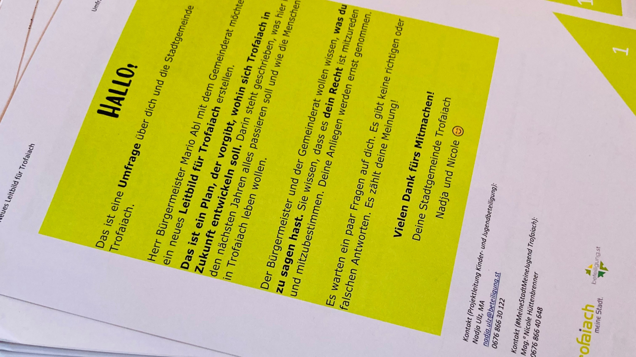 beteiligung.st wurde erneut mit der Kinder- und Jugendbeteiligung betraut. Projektleiterin Nadja Ulz, MA erfasste in Untersützung von Mag.a Nicole Hüttenbrenner, Ansprechperson für Jugendarbeit in Trofaiach, von Mai bis Juni die Sichtweisen aller Schüler:innen aus den örtlichen Volksschulen, der Mittelschule und Polytechnischen Schule. Damit konnten bislang weit über 500 Kinder und Jugendliche aus Trofaiach erreicht werden. An dieser Stelle bedanken wir uns bei den Schulleitungen und Lehrpersonal für Ihre Bereitschaft und die Zusammenarbeit!